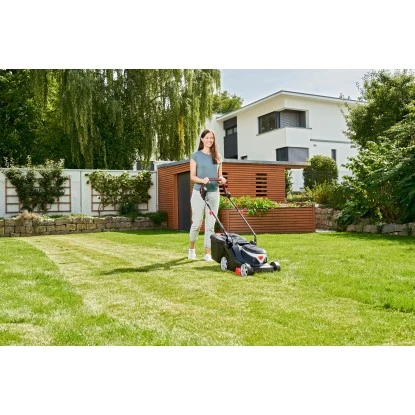 Dank des Kunststoffgehäuses wartet der Mäher mit einem geringen Gewicht auf und ist aufgrund seiner hohen Wendigkeit sowie der Schnittbreite von 32 cm ideal geeignet, um kleinere Gärten zu pflegen. Der 18 V Lithium-Ionen-Akku sorgt dabei für ein effizientes Arbeiten auf Rasenflächen mit bis zu 200 m².