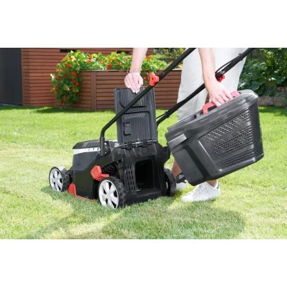 Mit nur einem Handgriff können Sie bequem die Schnitthöhe in 6 Stufen von 20 mm bis 75 mm einstellen. Die Kunststofffangbox mit Füllstandsanzeige fasst bis zu 35 l. Für den leichten Transport sorgt ein zweckmäßiger Tragegriff, der angenehme Bügelschalter steht für mehr Fahrkomfort.