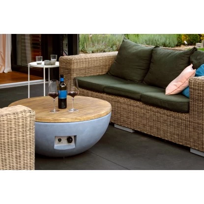 Die Steine sind ein hervorragender Wärmespeicher und verbreiten langanhaltende, angenehme Wärme, sobald sie erhitzt werden. Die Feuerschale wird mit Propangas betrieben und verfügt über einen elektrischen Anzünder, der über eine AAA-Batterie betrieben wird. Ein automatischer Abschaltmechanismus garantiert maximale Sicherheit bei der Benutzung der Feuerschale. Zu dieser gehören eine praktische Abdeckung in Holz-Optik, eine Polyester-Abdeckung, ein Gasschlauch mit Regler und ein Metallständer.