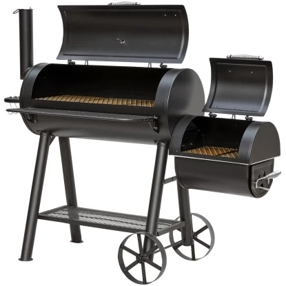 Das etwas andere Grillerlebnis – Feiern Sie Ihre Grillfeste und genieĂen Sie Ihre Speisen auf die amerikanische Art. Durch die Zubereitungsmethode des Niedrigtemperaturgarens werden Ihre Speisen besonders schmackhaft: Fleisch oder Fisch so saftig wie nie zuvor, GemĂŒse knackig und frisch. Durch die niedrige Gartemperatur beim Smoken von unter 100°C garen Ihre Speisen langsam und schonend. Das Gargut verliert hierbei kaum an Saftigkeit, da die FlĂŒssigkeiten bei diesen niedrigen Temperaturen (anders als bei herkömmlicher Zubereitung mit Temperaturen von bis zu 300°C) noch nicht verdampfen und die Speisen somit nie austrocknen. Die besondere Note wird den Speisen beim Smoken durch das Raucharoma verliehen. Je lĂ€nger die Speisen auf dem Grill verweilen, desto intensiver ist das Raucharoma in den Speisen ausgeprĂ€gt. ZusĂ€tzlich kann das Aroma durch die Beigabe verschiedener Hölzer wie z.B. Kirsche, Erle oder Pinie ins Feuer weiter verfeinert werden. Ihnen stehen also unzĂ€hlige Möglichkeiten offen, Ihren individuellen Geschmack zu erreichen oder einfach nur immer wieder Abwechslung im Aroma zu finden. SelbstverstĂ€ndlich kann dieser Grillwagen auch als herkömmlicher Grill zum Garen mit direkter Hitzeeinwirkung verwendet werden. Hierzu können in beiden Kammern Feuer entzĂŒndet werden, ĂŒber denen Sie Speisen zubereiten können. Dank der groĂen GrillflĂ€che können Sie auch gröĂere AnlĂ€sse spielend leicht bewĂ€ltigen.