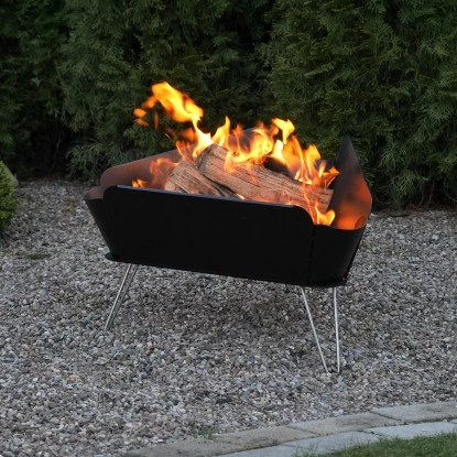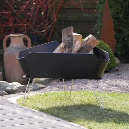 Die Vasner Feuerschale Merive M1 ist die perfekte Design-Feuerschale fĂŒr jeden Garten und jede Terrasse. Mit ihrem Korpus aus pulverbeschichtetem Stahl in mattem Schwarz und ihren silberfarbenen Standbeinen aus gebĂŒrstetem Edelstahl, sieht sie Ă€uĂerst elegant aus und passt farbtechnisch zu jeder Möblierung. AuĂerdem sorgt die Pulverbeschichtung fĂŒr eine geringere RostanfĂ€lligkeit und eine höhere HitzebestĂ€ndigkeit. Mit ihrer praktischen, dreieckigen Form passt sie auch in kleine Raumkonzepte. Durch ihre kurzen Standbeine ist die Feuerstelle gerade fĂŒr niedrige Sitzgelegenheiten wie z.B. Lounge-Gruppen bestens geeignet. Sobald die Feuerschale bei Ihnen angekommen ist, brauchen Sie lediglich die Edelstahl-Beine an den Feuerschalen Stahl-Korpus anbringen, die entsprechenden Schrauben und SchraubenschlĂŒssel sind in der Lieferung mit enthalten. Der Zusammenbau der Feuerschale ist binnen weniger Minuten vollbracht. Vorteilhaft ist auch die Leichtigkeit der Feuerstelle. Trotz der hohen QualitĂ€t des Materials bringt die Merive M1 nur 4,85 kg auf die Waage. So kann man sie kurzerhand in den Kofferraum einladen und ĂŒberall hin mitnehmen. Entfachen Sie in dieser auĂergewöhnlichen Design-Feuerschale ein stilvolles Feuer an all Ihren Lieblingsorten. Achtung! Zum EntzĂŒnden des Feuers dĂŒrfen KEINE flĂŒssigen Brandbeschleuniger (z.B. Spiritus, Benzin o.Ă€.) eingesetzt werden! Die deutlich höheren Temperaturen können SchĂ€den an der Pulverbeschichtung des Feuerkorbes zur Folge haben. Feuerschalen und Feuerkörbe entwickeln groĂe Hitze. Achten Sie daher darauf, dass diese in alle Richtungen genĂŒgend Abstand zu brennbaren Materialien haben und der Untergrund des Aufstellortes fĂŒr gröĂere Hitze geeignet ist, damit kein Schaden entsteht! Ausstattungsmerkmale: – Niedrige Höhe – passend zu Lounge-Sesseln – MaĂe (H x B x T): 40 x 57 x 59,5 x cm – AuĂergewöhnliches, modernes Design – Flach und offen fĂŒr 360° WĂ€rmeabstrahlung – Abgerundete Dreiecks-Form integriert sich auch in kleine RĂ€ume – Hochqualitative Fertigungsmaterialien – Extra robuster Korpus aus pulverbeschichtetem Stahl – Stabile Beine aus gebĂŒrstetem Edelstahl – Geringes Gewicht: 4,85 kg – Blitzschnelle Montage Lieferumfang: 1 x Merive M1 Schale 3 x Edelstahl Standbeine 1 x Montageset (Schrauben & SchraubenschlĂŒssel) 1 x Bedienungsanleitung